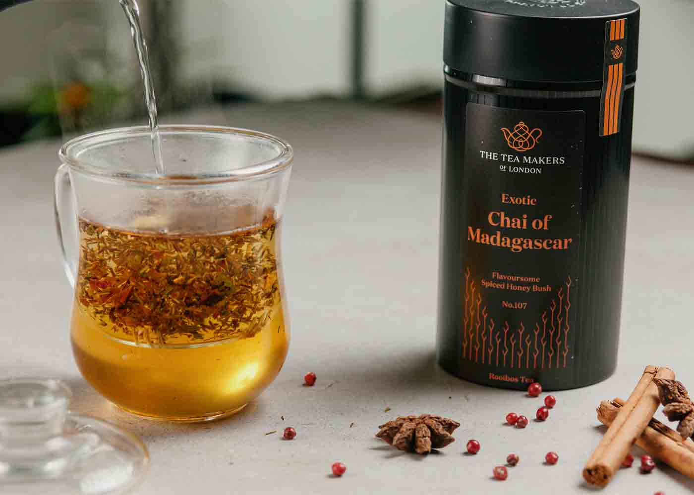 Wir haben auch unseren Chai aus Madagaskar ; eine köstliche Kräutervariante des indischen Chai, bei der traditionelle Gewürze wie Zimt, Ingwer, Kardamom und Nelken für Kräuter-Chai verwendet werden.